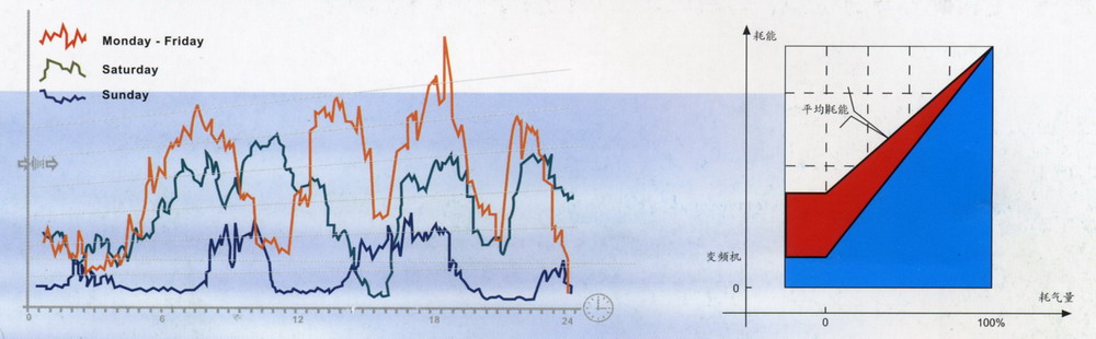传统的压缩机(标准机)通常采用ON/OFF及比例调节系统,通过调节压缩机进气口的开口量来对气量进行调节。该调节方式也可以较好地满足实际用气量的要求,但在整个调节过程中,压缩机的转速保持在额定转速,机器消耗的摩擦功、冷却液搅拌功等不会减少,因此虽然用气量下降,但实际耗能不会按比例下调,而变频调节能使其实际耗能基本按比例下降,能量更有效地被利用于空气的压缩上。 |